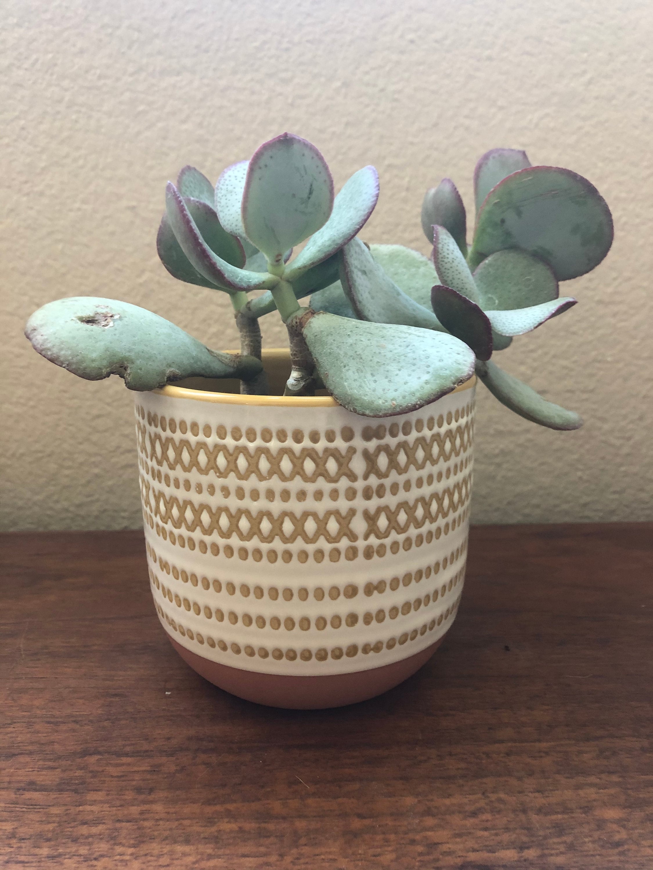 Cream colored 4 inch ceramic planter with mustard geometric design